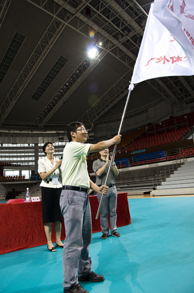 该活动主要分为两个环节,第一个环节为仪式环节,首先由李旭武宣读由组委会发布的全民志愿服务行动倡议书,宣读完毕后,我校人力资源副经理范聪从林少娜手中接过了广东外语外贸大学体育场馆志愿者服务队队旗。随后何越辉进行了发言,他首先赞扬我校学生对亚运志愿者活动的积极参与的精神和高昂的工作热情,并对在场的所有志愿者提出了四点希望和要求。而林少娜则表示,今天的行动是我校师生献给亚运的最好的礼物,“我们用我们的实际行动向各方宣告我们已经做好了迎接来自五湖四海的朋友的准备,我们会用干净的亚运场馆来迎接亚运的到来。”