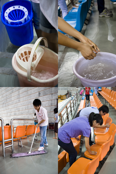 志愿者清洁工作细致到场馆的角落
