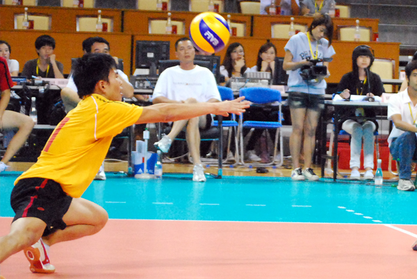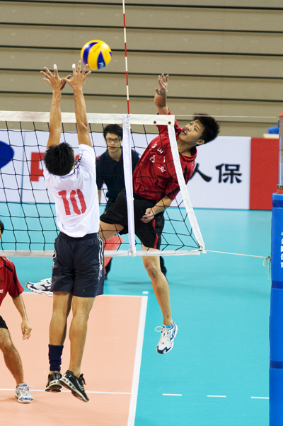 首盘开局培英还没有找到状态,遭到对手网前压制,连续失掉5分。一中队里以力量型选手居多,6号队长邓子劲、4号刘庆明和7号余世文都是扣杀的好手。本场比赛,余世文表现神勇,利用对角线的扣杀巧妙避过网前的两名拦网队员,球快速地“钻入”培英中场空当。反观落后的培英,在一中发球失误失掉一分时才如梦初醒,前后场开始打出有效的攻防配合。双人拦网多次封死一中队员招牌式的大力扣杀,培英逐渐打出气势高涨的反攻,在落后7分的不利情况下,把比分逼平至22:22。但培英球员们在最后关键球的处理上稍显冒失,两个扣球接连出界,22:25,一中有惊无险地拿下首局。