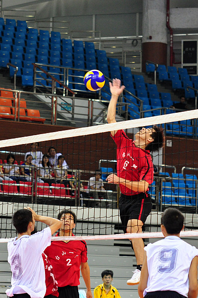 台山一中主攻手高高跃起击球