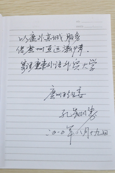 视察结束后,孔茂胜即席挥毫,在贵宾签到的本子上留下一行苍劲有力的大字以寄托他对广外亚运场馆团队工作的期望:“以广外真诚服务,传广州亚运激情!”