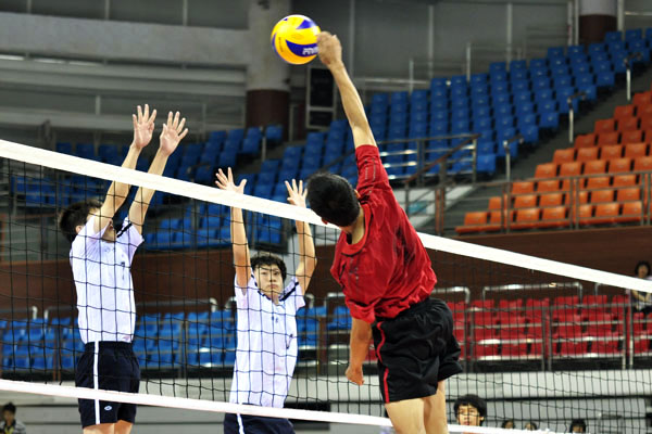化州一中队员跳起拦网