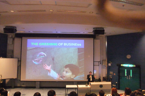 首日开幕式,香港科技大学商学院教授Paul Forster致辞。他向各位远道而来的同学和老师表示欢迎,并阐释了他对绿色生活和可持续发展的理解。Paul Forster提到在提倡绿色生活的同时,需要兼顾社会环境、科技和经济。只有在这三者中找到平衡,环境保护才能够真正得到实现。