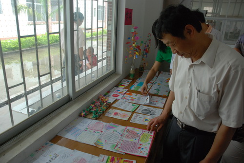莲塘小学队员指导小学生用废弃编织袋、塑料纸制作的环保时装表演  | | 许国彬参观教学成果展 |