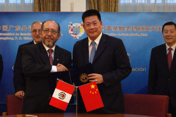 下午2时,我校党委书记隋广军、校长仲伟合、副校长方凡泉在迎宾厅会见了代表团并与他们进行了亲切交谈。隋广军和仲伟合对秘鲁客人的来访表示热烈的欢迎,并对阿贝尔校长、胡琉前校长对两校合作以及孔子学院工作的大力支持表示衷心的感谢,对哈伊米院长和李砾院长的热情投入和重要贡献表示赞赏。阿贝尔校长表示秘鲁圣玛利亚天主教大学出于对中国文化的浓厚兴趣,远道而来,希望能在现有合作的基础上进一步拓展两校之间的交流与合作。随后,仲伟合和阿贝尔分别代表两校在第三会议室签署了校际合作协议。阿贝尔向隋广军和仲伟合颁发了秘鲁圣玛利亚天主教大学荣誉教授聘书,隋广军向阿贝尔和胡琉颁发广东国际战略研究院客座研究员聘书。接着,隋广军和胡琉在迎宾厅为我校拉美研究中心揭牌。我校国际交流处处长焦方太,广东国际战略研究院秘书长、科研处处长李青,西语学院党委书记黄巧萍,孔子学院中方院长李砾一同出席了两校校际合作协议签署仪式和拉美研究中心揭牌仪式。