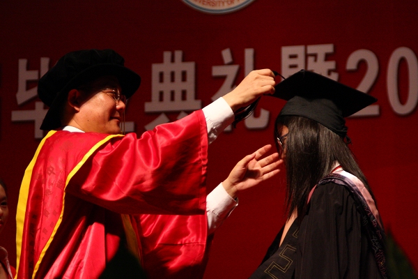 我校首次采用国际化的学位授予仪式,校长为每一位学士拨穗,代表稻穗或麦穗成熟,象征毕业生已学有所成,可以展翅高飞。毕业生身着黑色学士袍依次上台与仲伟合握手、微躬身接受拨苏、接受仲伟合颁发的学位证书并与之合影,三天之内,仲伟合会和五千多名毕业生一起完成这一庄严神圣的仪式。