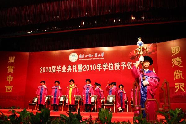 又是一年离别时,聚散两依依。6月26日至28日,我校为期三天共分九场的2010届本科学生毕业典礼暨学位授予仪式在北校区云山会堂和南校区大会堂依次进行。此次我校采用全新的、与国际接轨的学位授予仪式,广外权杖首次亮相,校长仲伟合亲自为五千多名2010届本科毕业生逐一“拨穗”。校党委副书记陈建平、许国彬、金耀观,副校长方凡泉、董小麟、顾也力、陈子锐、刘建达、石佑启以及陈德萍等校领导作为主礼教授出席典礼。