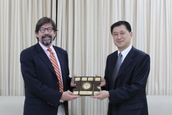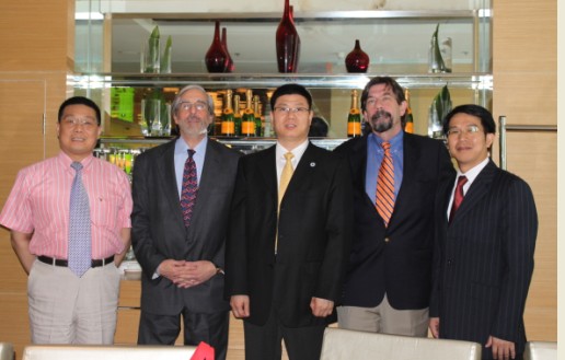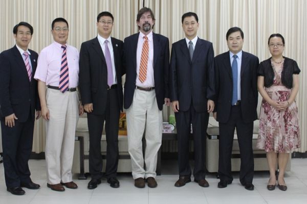 本网讯 6月15日下午,我校党委书记隋广军在北校区六教贵宾室会见了来访的美国新泽西州立大学罗格斯商学院高级副院长Thomas Gombar博士和对外经济贸易大学特聘美籍教授刁凤河。国际交流处处长焦方太,MBA教育中心执行主任孙建军、副主任吴易明、主任助理马绍壮和办公室主任徐艺青参加了会见。
