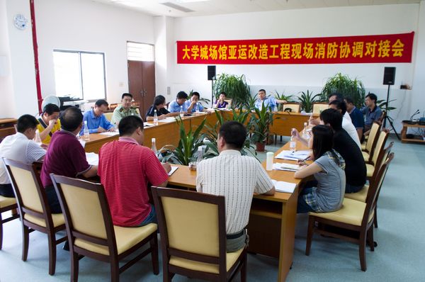 本网讯 18日下午,大学城亚运场馆改造工程现场消防协调对接会议在我校大会堂A区103室举行。多个大学城场馆团队齐聚我校,一起开会协商亚运场馆改造工程现场的消防问题,这在召开消防协调对接会议以来还是首次。