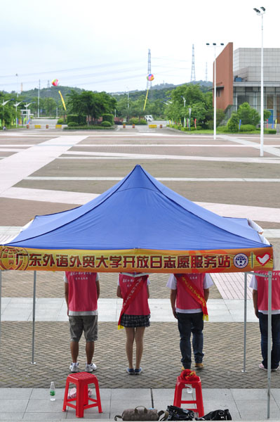 在空旷的图书馆广场,静静地伫立着一顶帐篷,帐篷下站着三个默默工作的工作人员。他们远离了咨询现场的热闹,远离了文化广场的精彩活动,但是他们的热情却如今天的骄阳一般高涨。从早上7点到中午11点,Panny、小吴和小萧一直坚守在咨询点接待陆续来到的家长,虽然只是简单的几句引导性话语,却为家长们打开了开放日的第一道门,为开放日拉开了一道亮丽的帷幕。