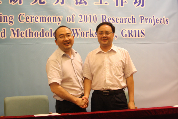 本网讯 6月10日下午,广东国际战略研究院2010年度课题签约仪式暨研究方法工作坊会议在北校区国际会议厅召开。北京大学政府管理学院副院长李国平、香港理工大学中国商业中心主任陈文鸿,我校党委书记、广东国际战略研究院常务副院长隋广军,副校长石佑启,广东国际战略研究院相关人员、2010年度课题项目负责人及我校各学院老师等参加了会议。会议由广东国际战略研究院秘书长李青主持。