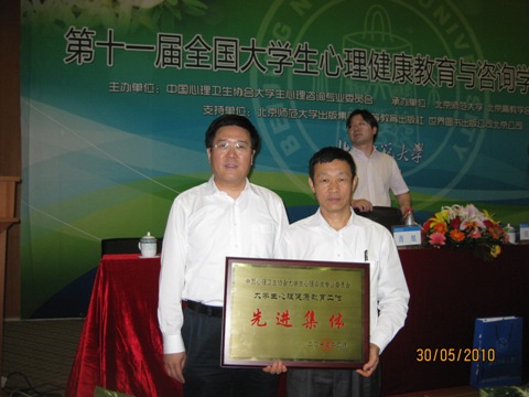 我校于1992年成立心理咨询中心(后更名为“心理健康教育与咨询中心”),18年来成绩突出,获得全国同行的认可,在这次会上荣获“全国心理健康教育工作先进集体”称号。这是我校继全国就业先进集体和全国五四红旗团委后,在学生工作方面获得的又一项全国性的荣誉。我校党委副书记许国彬近二十年来积极投入于心理健康教育与咨询中,并推动我省心理健康教育工作的开展,成绩斐然,获得“全国心理健康教育工作先进个人”荣誉称号。