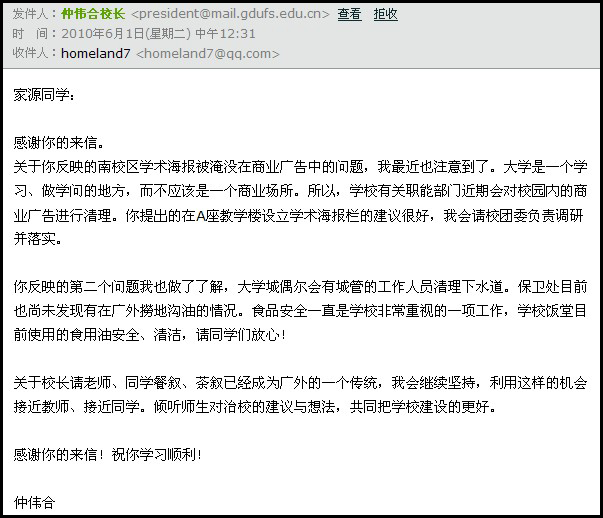 抱着试试看的心理,记者昨晚十点左右向校长信箱发送了一封电子邮件,提了三方面的问题,今天上午便得到了校长的亲自回复。