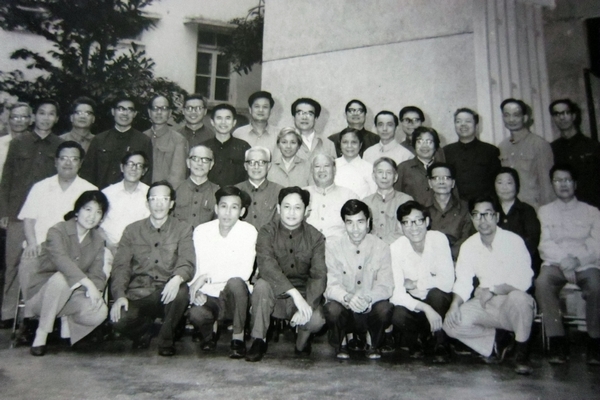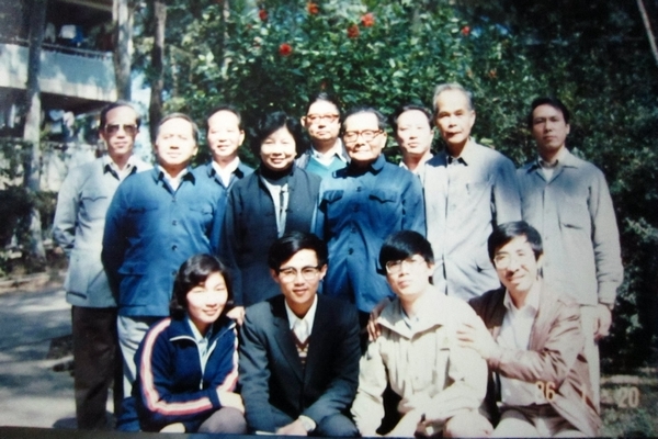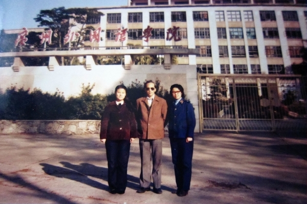 何自然教授(中)与同事们摄于原广州外国语学院门口(翻拍)