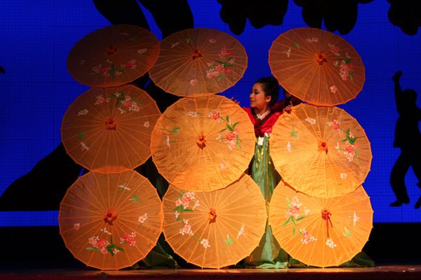 伴着耳熟能详的韩国民谣《阿里郎》,东语学院的“韩国少女”们撑着黄色蜡伞,伞下的女子娇羞柔美,在油纸伞开合的瞬间犹如少女情怀的绽放,对情郎的追随,“春天黑夜里满天星辰,我们的离别情话千遍难尽!阿里郎,阿里郎,阿拉里哟!”