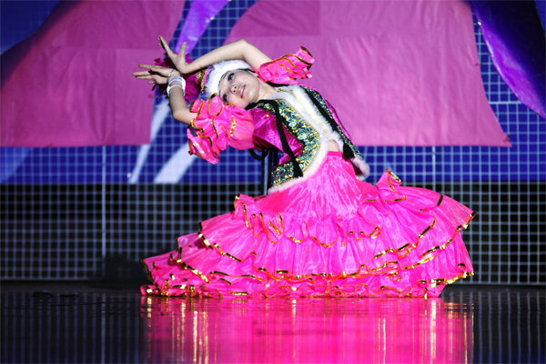 留学生院的《哈萨克民族独舞》一开场就渲染了浓郁的中亚风情。热情奔放的哈萨克少女连续旋转十几个圈的高技巧动作宛如怒放的粉色花朵,赢得了观众的阵阵掌声。