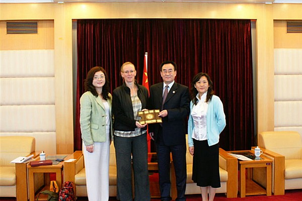 顾也力(右二)向蕾玛莉女士(左二)赠送纪念品