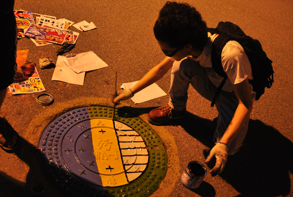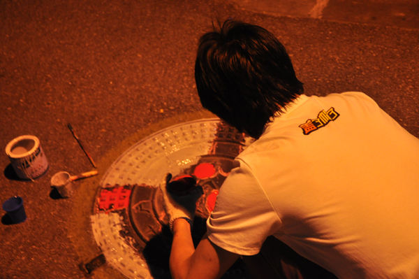 本网讯 5月3日晚约9点半,广外生活区南苑校道上出现了一群“特殊”客人,他们用颜料和画笔,在南苑校道的下水道井盖上开始了一场非同寻常的作画。据了解,他们是来自广州美术学院“盖了帽了”井盖文化小组,自去年5月份起,已在广美、星海、广大、华师对各个学校的井盖进行了“改头换面”。今天,这群“艺术家”又带着心爱的画笔,来到了广外。