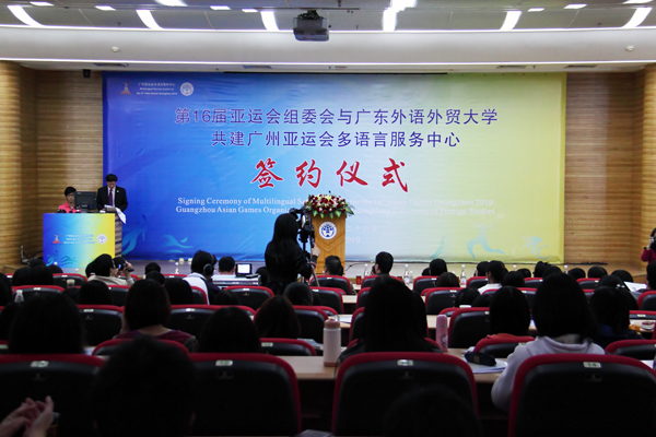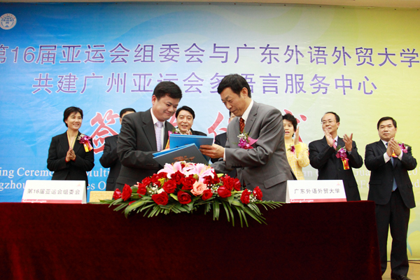本网讯 4月26日晚6点30分,第16届亚运会组委会与广东外语外贸大学共建广州亚运会多语言服务中心签约仪式在我校图书馆多媒体报告厅举行。