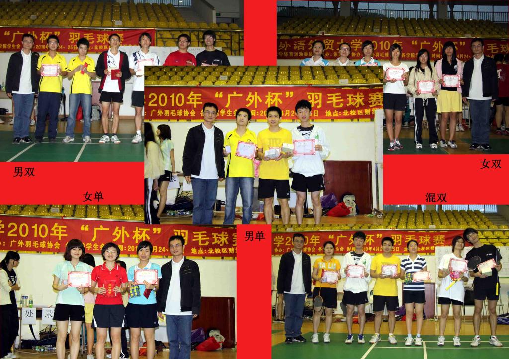 本网讯 4月24日和25日,2010年“广外杯”羽毛球赛在北校区财经学院体育馆隆重举行。来自南北两个校区400多名选手在男单、女单、男双、女双、混双五个项目上展开了激烈的争夺。经过两天的激烈角逐,黄景全和蔡轶嘉分别将男单女单冠军收入囊中,而男双、女双和混双的冠军则依次由何俊杰、陈禹鋆(公开学院)、蔡轶嘉、关洁灵(法学院)和黄景全、成思(研究生)获得,而法学院则夺得今年新增的团体奖第一名。