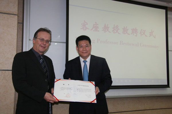 本网讯 4月14日上午,我校聘请英国考文垂大学商学院副院长Donald Finlay博士为客座教授的仪式在北校区六教黄华讲堂隆重举行。校长仲伟合、国际学院院长陈林汉、MBA教育中心执行主任孙建军、考文垂大学研究生实习部部长Marie Hardie女士及09级全日制MBA学生参加了仪式,仪式由MBA教育中心副主任吴易明主持。
