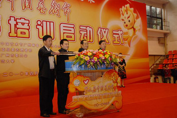 本网讯 4月15日下午,“赏亚运风韵,展志愿风采”——第九届中国艺术节志愿者招募培训启动仪式在华南师范大学(石牌校区)手球馆隆重举行。“九艺节”广州筹委办主任、广州市文化广电新闻出版局局长陆志强,“九艺节”广州筹委办常务副主任、广州市文化广电新闻出版局副局长张润华,团市委副书记、亚组委志愿者部副部长魏国华等领导出席了启动仪式。启动仪式上,我校等单位被授予“第九届中国艺术节志愿者招募培训示范基地”及“九艺风韵志愿传播队”队旗;倪惠英、谢杏芳、傅靖祺、李佳、彭新智等文艺体育届知名人士获颁“九艺节”荣誉志愿者。