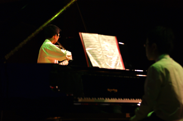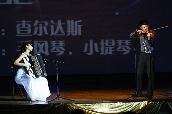 第二部分,5号组合VIP(王熠恒和杨俊凯)用小提琴和钢琴演绎了一曲精彩的《黎家代表上北京》,为我们讲述了一个黎族人民翻身做主的故事。小提琴婉转悠扬的旋律中带着悲凉与辛酸的感情,仿佛在诉说着过去悲惨痛苦的生活。一段沉默后,钢琴的强烈敲打击碎了悲伤的音符,欢快的旋律告诉我们黎族人民翻身做主,过上了幸福的生活。王熠恒和杨俊凯对于曲子的熟练以及技巧的纯熟程度在他们落落大方的台风中表现得淋漓尽致。