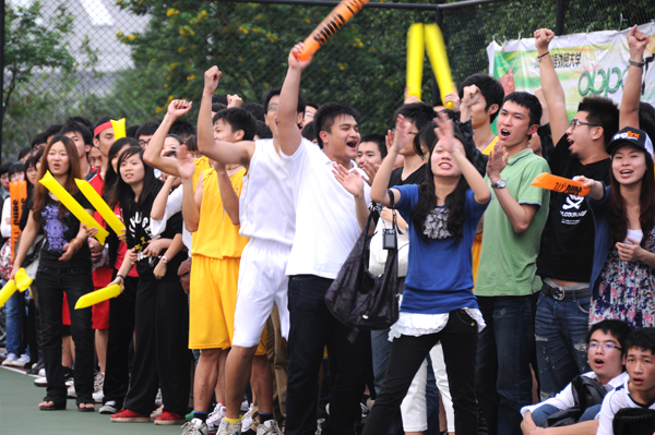 比赛还未开始,热情的球迷就把球场里三层外三层围得水泄不通,啦啦队更是出动充气棒为自己的球队加油助威,下午4点45分,南校区决赛正式打响。