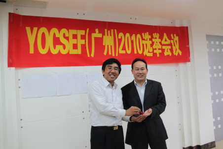 YOCSEF秘书长刘雨将YOCSEF(广州)印章交给阳爱民(右)