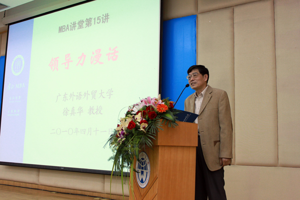 本网讯 4月11日下午,我校原党委书记徐真华教授在北校图书馆学术报告厅为我校师生带来主题为“领导力漫话”的精彩讲座。本次讲座为广外MBA讲堂第15讲,由MBA教育中心和MBA学生联合会主办,副校长石佑启、研究生工作部部长敖湘晖、国际交流处处长焦方太、教务处副处长尚敏锐以及财务处副处长朱红等相关部处和学院的领导均出席讲座。讲座由MBA教育中心执行主任孙建军主持。