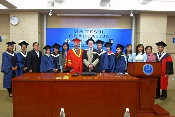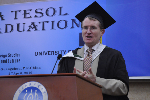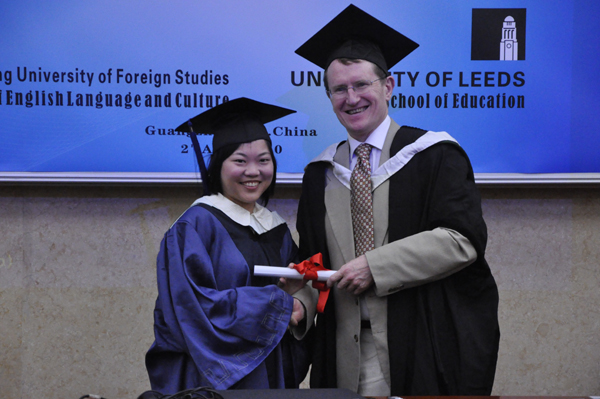 本网讯 4月2日上午,英国利兹大学-广东外语外贸大学第四期英语教学硕士(MA TESOL)毕业典礼在我校黄华讲堂隆重举行。我校党委副书记陈建平,研究生部部长敖湘晖,国际交流处副处长梁洁,英语语言文化学院院长刘岩,利兹大学导师Richard Badger、第四期毕业学员及家属和第五期就读学员出席了毕业典礼。毕业典礼由英文学院院长助理胡正茂主持。