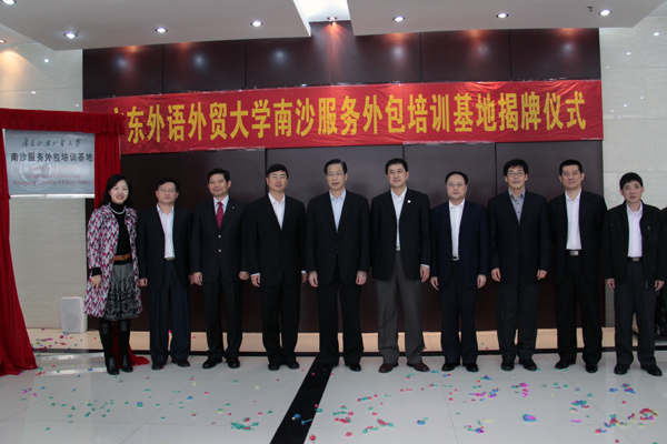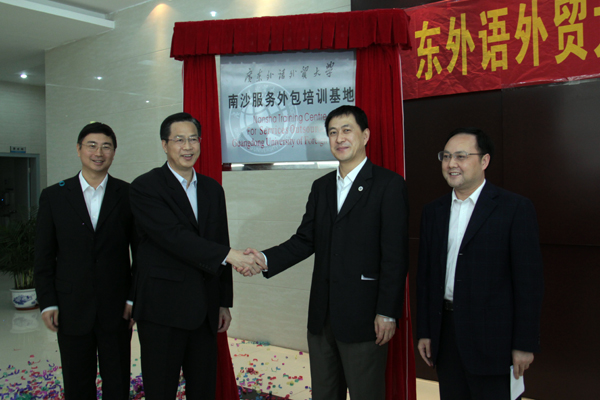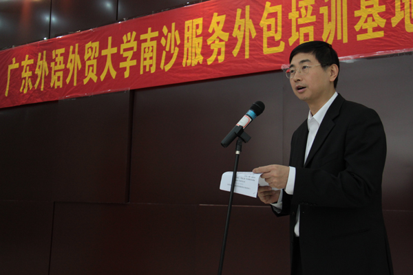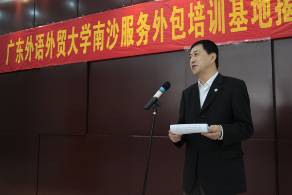 隋广军在揭牌仪式上致辞。他首先对广东省市领导、南沙区领导特别是陈明德所给予的支持与帮助表示衷心感谢。隋广军介绍道,在“有序承接离岸服务外包业”写入国家“十一五”规划、广东省愈加重视服务外包业发展的背景下,我校要更加重视服务外包型人才的培养,优化人才培养模式。他强调,认真贯彻落实《珠江三角洲地区改革发展规划纲要》精神,大力培养国际服务外包型人才是我校的光荣使命与不可替代的责任。他在回顾我校与南沙开发区的合作后指出,南沙服务外包人才培训基地是双方深度合作的实质性举措,对我校与南沙的共同发展均具有非常深远的意义。最后,隋广军寄望我校能为南沙区发展尽一份力、添一份光彩。