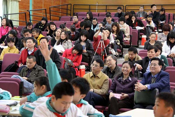 课前,刘志明和郭思乐分别谈到他们对于“生本教育”的理解。刘志明认为,“生本教育”是素质教育的突破口,把关注从教师和教材转移到学生身上。在谈到附校“生本教育”的发展时,她自信地说:“我们的改革虽然不是最早的,但改革是比较彻底的:从部分学科和年级逐步扩展到所有学科和年级,全面实施生本理念。”