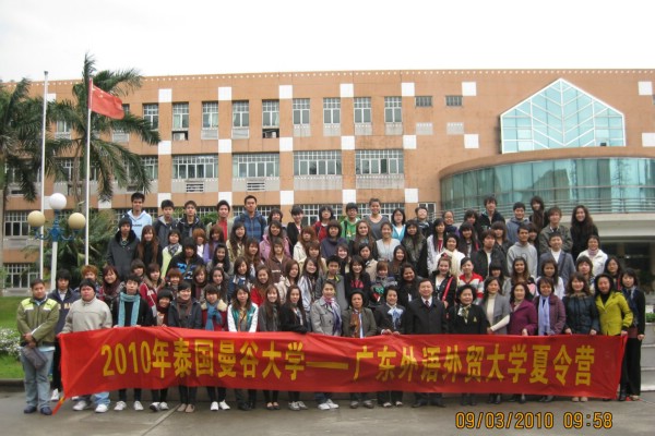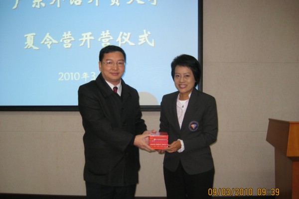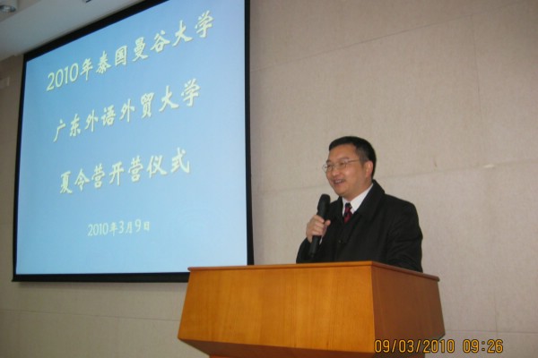 本网讯 3月9日上午,2010年泰国曼谷大学——广东外语外贸大学夏令营开营仪式于北校MBA教育中心106阶梯教室举行。出席仪式的泰方代表包括曼谷大学人文学院副院长布帕、泰语系主任素察叻以及泰国友谊文化学院的常瑞老师、欧雄斌老师,我校代表则有国际交流处副处长梁洁、留学生教育学院院长梁学宏、副院长吴璇,泰语系老师罗奕原、外籍教师布帕·汶提。