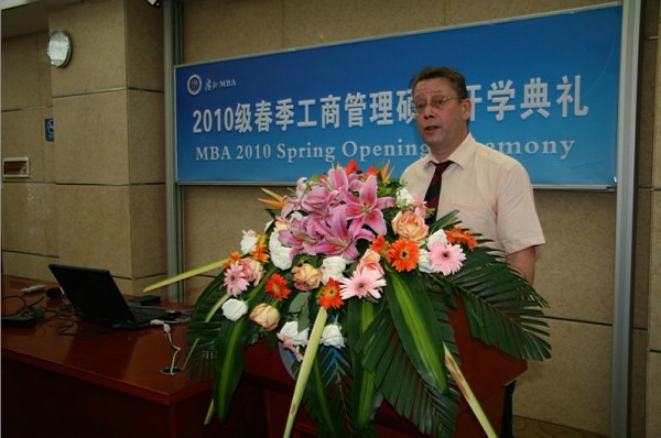 外教Peter Knight作为MBA教师代表发言,他认为MBA教育与一般的研究生教育不同,同学们来自不同的行业,有着不同的工作经验,希望大家珍惜MBA学习这个难得的机会,学会分享,互相帮助,接受挑战,敢于改变。