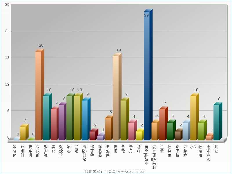 为了更好地了解谁是大家心目中公认的魅力女性,本网记者特意发放了一份名为“谁是您心中的魅力女性”的调查问卷,问卷中列出了数十位近现代不同领域里的杰出女性,有的在政坛立下丰功伟绩,有的是银幕上不朽的美丽印象,有的在文坛占有重要地位,还有的是在体坛或娱乐界中深受欢迎的女性。