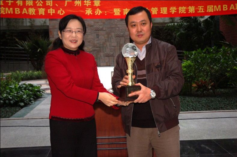 华南联盟足球联赛颁奖典礼上,我校MBA教育中心副主任吴易明代表MBA教育中心对主办方暨南大学的精心组织致以感谢,并对我校MBA队员的团结拼搏表示赞赏。MBA联合会主席王进宏代表广外MBA足球队上台领取冠军奖杯,我校MBA足球队队长陈建华则以10个进球的出色表现荣获“最佳射手”称号。