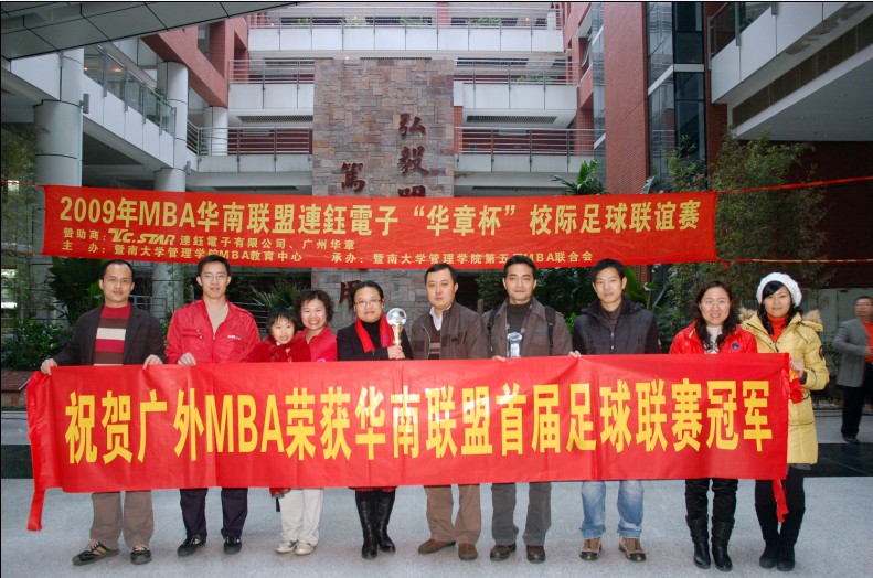 本网讯 1月24日,历时一个月的2009年MBA华南联盟连钰电子“华章杯”校际足球联谊赛圆满落幕,我校MBA男子足球队一路过关斩将,战胜中山大学和华南理工大学等劲旅,勇夺桂冠,迎来2010年的开门红。
