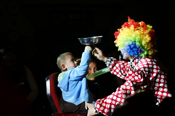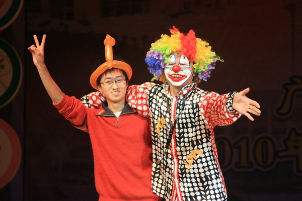 此次演出的一个亮点就是小丑和魔术表演首次登上团拜会的舞台。只见两个快乐的小丑身着睡衣,头顶五颜六色的“爆炸头”,让人忍俊不禁的抛球、抛环表演使全场气氛达到了一个高潮。而在魔术表演中,被互动观众五花大绑的魔术师却在五秒钟之内把观众身上的衣服换到了自己身上,而那些绳索竟也绑在那件衣服上,真是让大家叹为观止。而在随后我校播主专业的同学带来的惟妙惟肖的动画及电影配音更是让大家领略了声音的魅力,蜡笔小新的调皮可爱,《风声》的明争暗斗为大家带来了新鲜的视听享受。