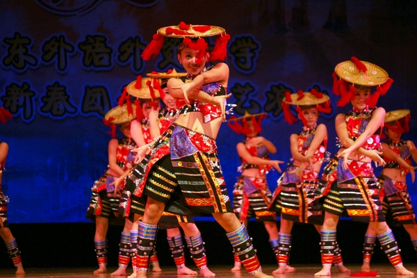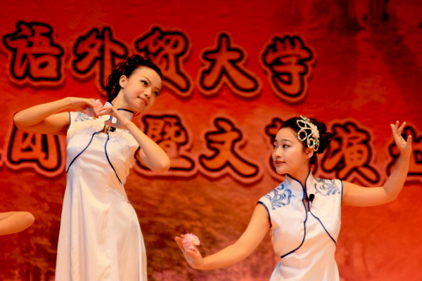 艺术学院12名女生身着飘逸的“青花瓷”旗袍,手持一花,亦唱亦舞地表演了经久不衰的民族经典《茉莉花》,展现了清新淡雅的古典美,令人陶醉其中。甩动的绿色水袖、精美的刺绣腰带,《踏歌》以其华丽的服装和优美的舞蹈动作为大家呈现了一派盛世气象。而独具民族特色的舞蹈《花腰花》则给观众们带来了耳目一新的感觉。在昏暗的舞台深处,传来阵阵呢喃低语和银铃阵阵,头戴斗笠、脚绑银铃的少女仿佛人间的精灵翩翩起舞。振奋人心的大鼓与如泣如诉的箫声完美结合,将舞蹈一次又一次地推上高潮。在最高潮处却戛然而止,又是一阵低语,又是一阵清脆的银铃。仿佛不曾发生过什么一样,此时无声胜有声。让人怀疑难道真是坠入人间的精灵?引发观众无限的遐思。