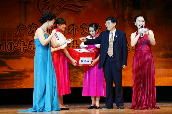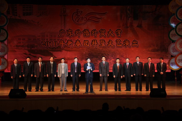 出席本次团拜会的有校党委书记徐真华,校长隋广军,校党委副书记陈建平、许国彬、金耀观,副校长方凡泉、董小麟、顾也力、陈子锐、仲伟合、刘建达、石佑启、陈德萍。演出开场后,《剪纸姑娘》首夺观众眼球,只见舞者身着印有中国传统剪纸的喜庆服装,以动人舞姿点燃起全场观众的热情。随后,徐真华代表学校党委和行政发表新春致辞,他给大家带来虎年新春的祝福和问候。徐真华说,在2009年,广外在教学和科研等工作上都取得了显著的进步,成绩可喜可贺。他希望在新的2010年里,广大教职工能够团结一心,再创辉煌,共同谱写和谐发展的新篇章。