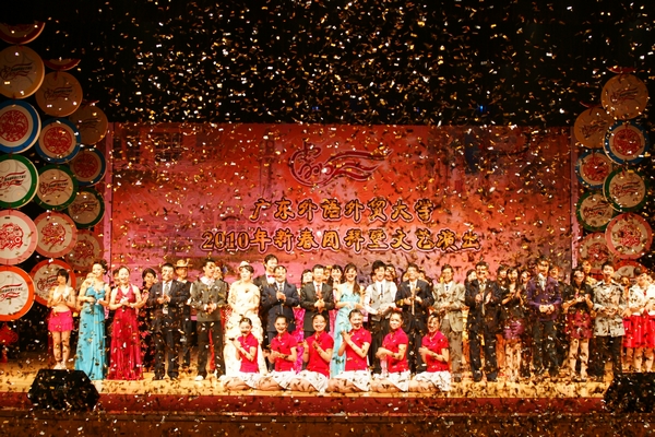 最后,熟悉的校歌《凤鸣岭南》的音乐响起,校领导及所有演职人员聚集台上,齐声合唱。一曲终了,礼花齐放,2010年迎春团拜演出完美落幕。