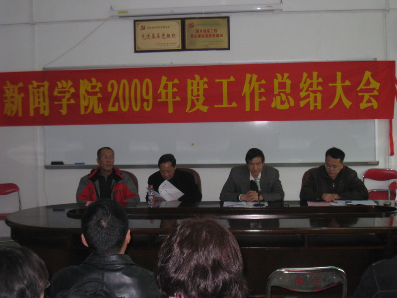 郭光华院长用“丰收的一年”来概括新闻学院2009年在科研、教学、师资与学科建设、学生工作、制度和文化建设等各方面的工作。科研工作方面,新闻学院积极参与学校“两院两基地”建设,已在“国际服务外包研究院”获“文化产业服务外包团队”立项;纵向科研课题获较大增长;横向课题获大的突破。教学工作方面,实习基地建设获得长足进展,新增校级精品课程两项等等。师资队伍与学科建设方面,分别引进了广告学和播音主持艺术专业的学科带头人,广告学专业顺利通过专业学位授予权评估,完满完成首届播音主持艺术专业汇报演出等等。在学生工作方面,毕业生就业率连续8年达100%,学生活动屡出精品。在制度和文化建设方面,2009年度完善和出台了一批规章制度,完成了学院文化长廊的建设。