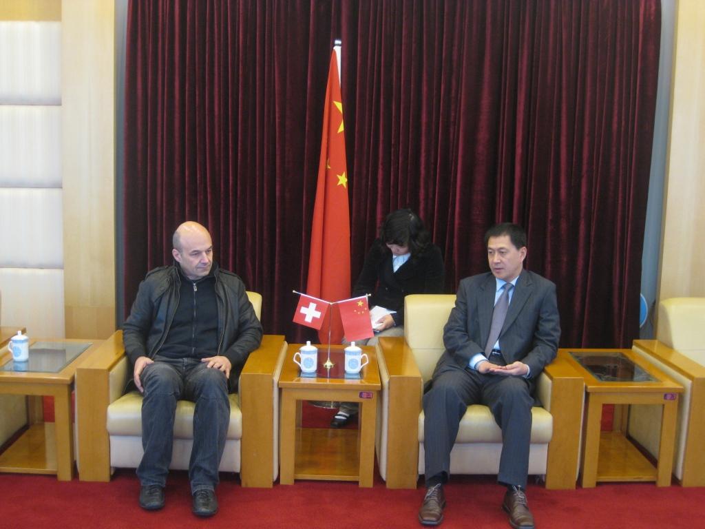 随后,我校校长隋广军在北校迎宾厅亲切会见了来宾,陪同会见的有国际交流处副处长梁洁等。隋广军对彼特教授等一行的到来表示热烈欢迎。他表示这是自去年3月瑞士联邦政府驻华科技文化中心执行主任史凤雅博士等一行来我校访问后,今年第一次迎来瑞士教育界的来宾。隋广军向来宾介绍了我校的概况。他表示,我校正在着力打造国际化特色鲜明的高水平的教学研究型大学。学校在培养学生时,注重专业与外语相结合,使我们的学生能更好地适应国际化的进程,参与国际化的竞争。他希望我校能和瑞士高校在艺术设计、新闻传播、信息技术等领域进行合作。