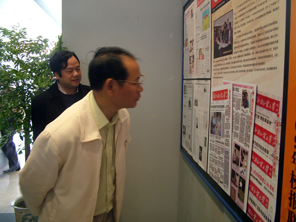 李小鲁在我校校报展板前驻足观看