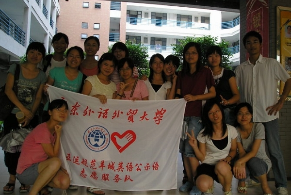 “迎亚运规范羊城公示语”英语公示语活动是由广东外语外贸大学青年志愿者行动指导中心在2008年4月启动举办的大型志愿服务活动。本活动旨在引导学生研究广州市的英语公示语规范,并查找广州城内出现翻译错误、拼写错误、语法错误、用法错误等不规范英语公示语、提出改正意见并进行研究总结。
