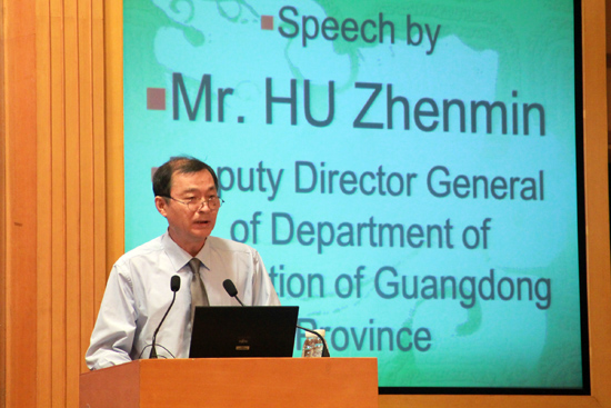 胡振敏在发言中表示,广东省作为中国对外开放的传统窗口,是外向型经济发展的先行区,经济社会发展要求广东进一步加强国际教育合作、推进国际教育进步,早在2004年,广东省委省政府就将高等教育国际化列为教育现代化建设的目标。而近年来,广东省着力推进高等教育事业发展,也取得了一些跨越性的成绩,他表示,广东将充分利用和开拓国际资源促进国际合作,吸引更多境外优质教学资源,到2020年能有3到5所世界知名大学在珠三角地区合作办学。