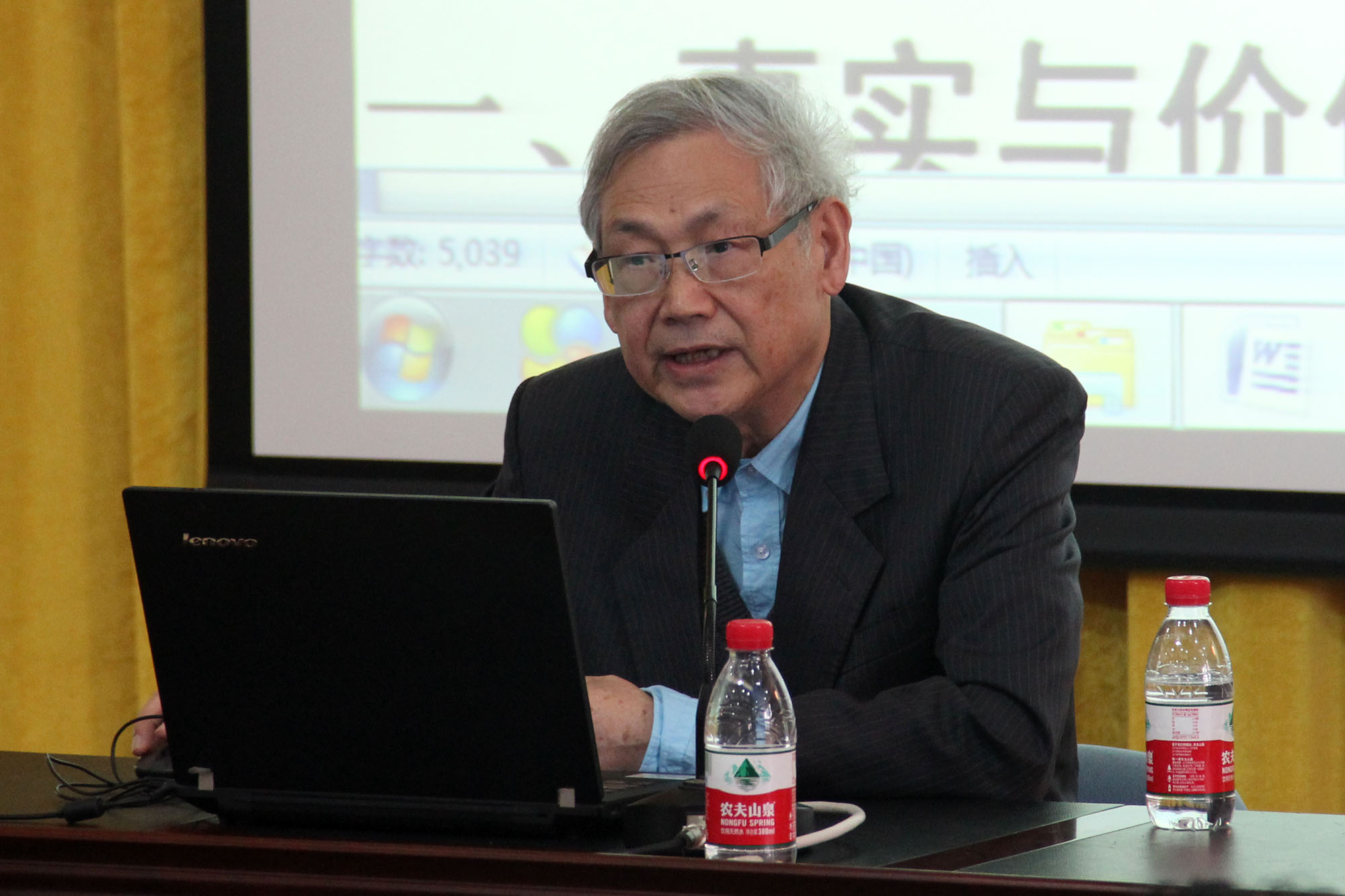 钱冠连首先发表了题为《眼光、(语言)事实和价值——兼论学者的宁静心》的演讲。其发言分三部分,分别为:事实与价值配对,语言哲学与语言研究,宁静心态:为研究、为写作、更为人生。钱冠连认为,对同一个事实,不同的眼光会发现不同的价值,什么样的眼光,决定了从事实中发现什么样的价值。钱冠连以索绪尔为例子解释了这个观点:“他(索绪尔)能发现语言事实中的价值,就是因为他有哲学眼光:不忘讨论存在、时间、事物、精神与意义等等。”
