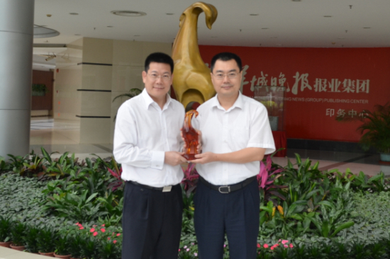 本网讯 4月25日上午,校长仲伟合率队前往羊城晚报社印务中心及羊城创意产业园,与报社负责人探讨深化双方的合作事宜。羊城晚报社社长刘红兵、总编辑刘海陵以及社委汪令来等与仲伟合校长、顾也力副校长一行进行了广泛交谈,双方就一些具体合作事项达成重要共识。