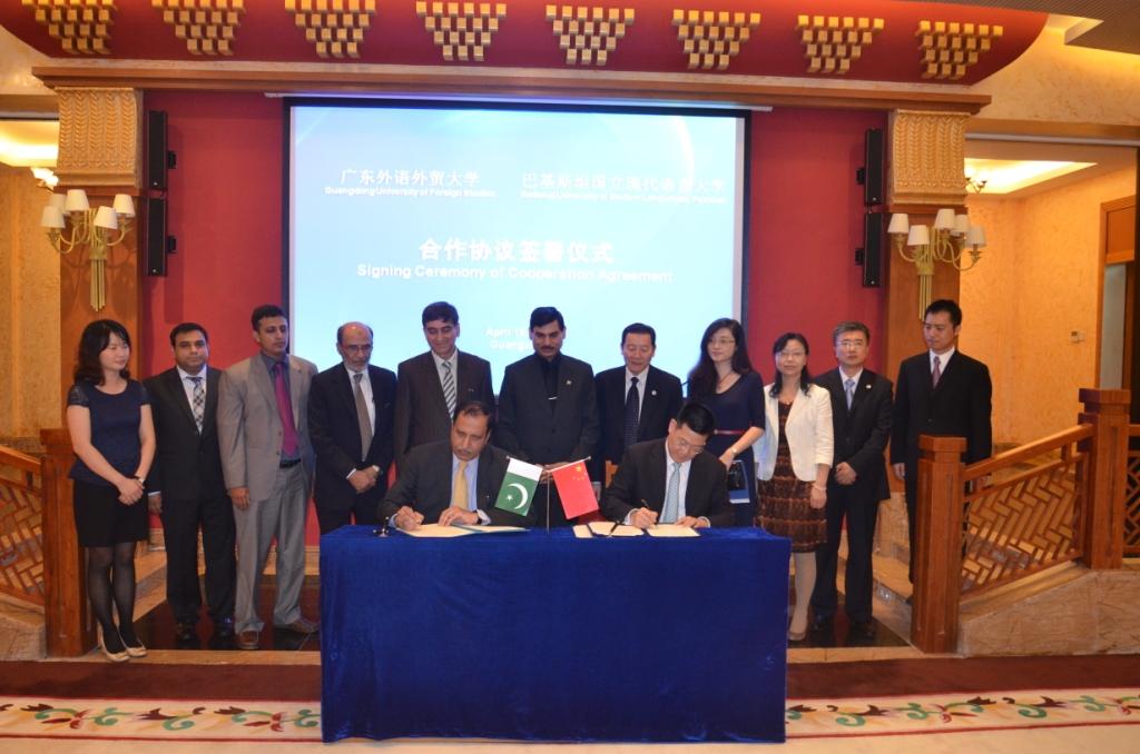 本网讯 4月18日上午,巴基斯坦国立现代语言大学校长马苏德·哈山(Masood Hasan)、副校长阿扎姆·贾马尔(Azam Jamal)等在巴基斯坦驻广州总领事巴伯·阿明(Babar Amin)的陪同下来访我校。我校校长仲伟合在北校贵宾厅亲切会见来宾并与之签署了两校合作备忘录和交换生协议。